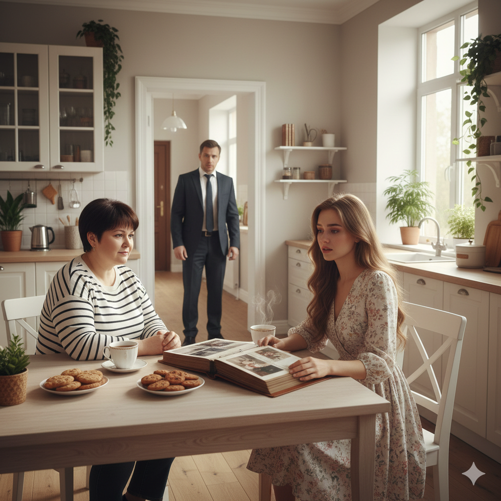 В гостиной на диване сидела Галина и Олеся, рассматривали фотографии в альбоме.