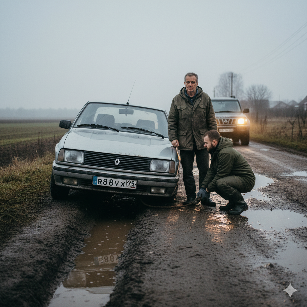 Они с Сергеем опять зашли в лужу и стали помогать джипу вытягивать Рено из грязи.