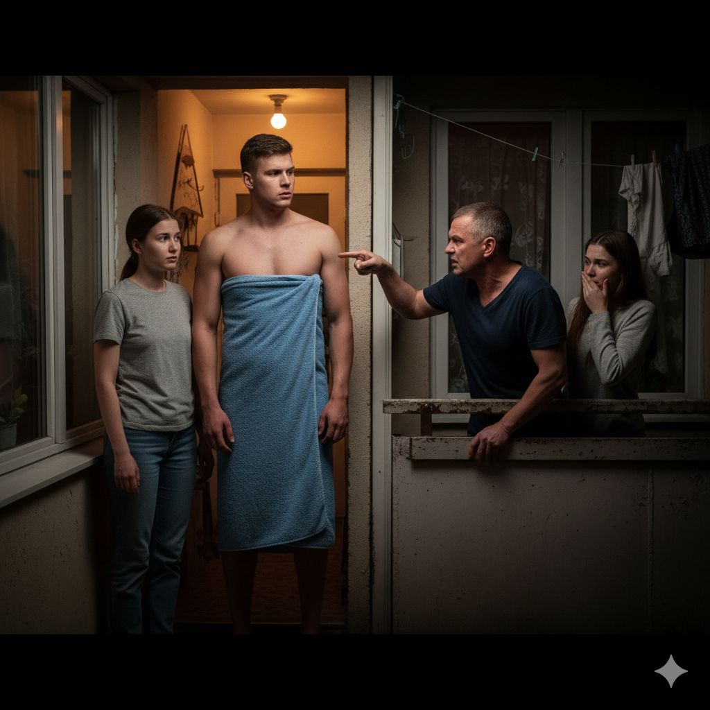 Парень схватил с веревки первое попавшееся полотенце и прикрылся им.