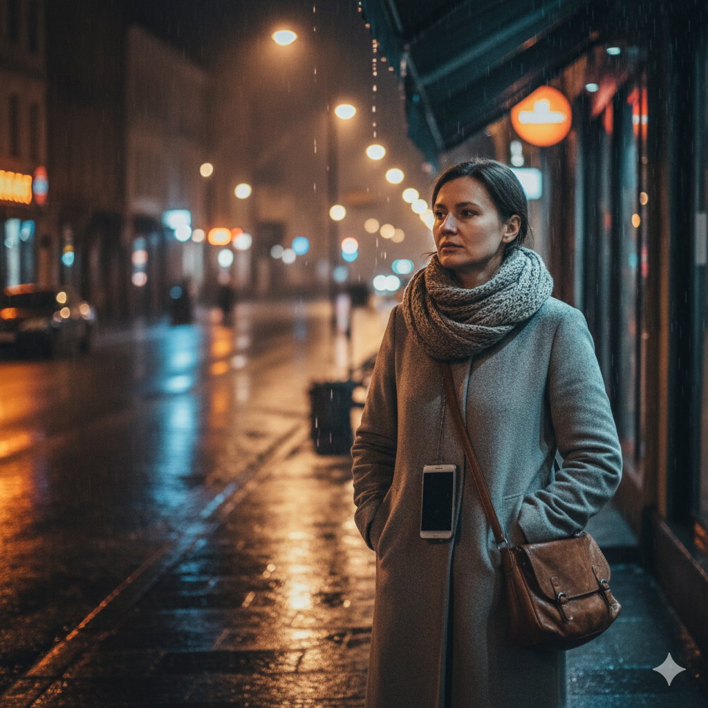 Она натянула шарф, сунула телефон в карман. На улице моросил дождь, под ногами скользко. Свет в окнах — тёплый, чужой.