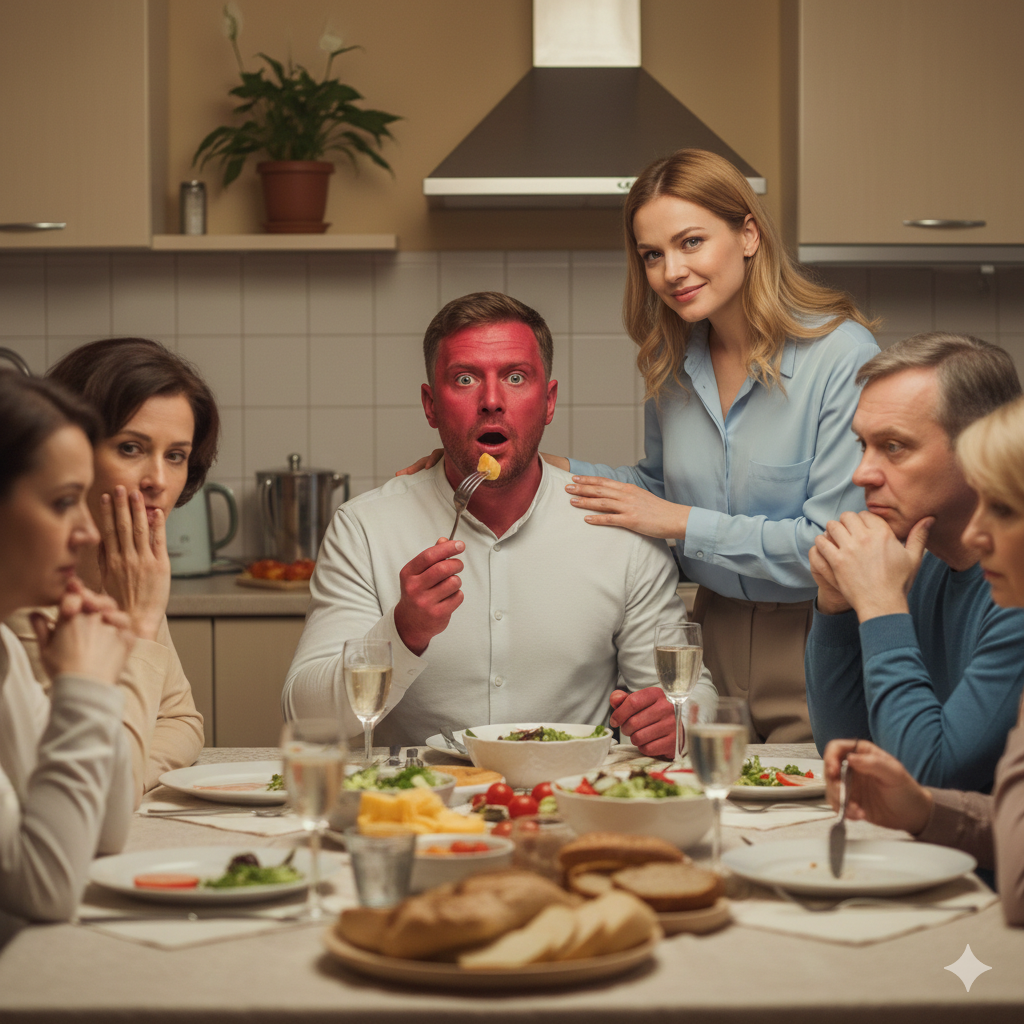 Все за столом замолчали и уставились на Лёшу. У Лёши в горле застрял кусок сыра, рот тоже был набит смесью салата и оливок. Он стремительно начал краснеть. Ира заботливо похлопала его по спине.