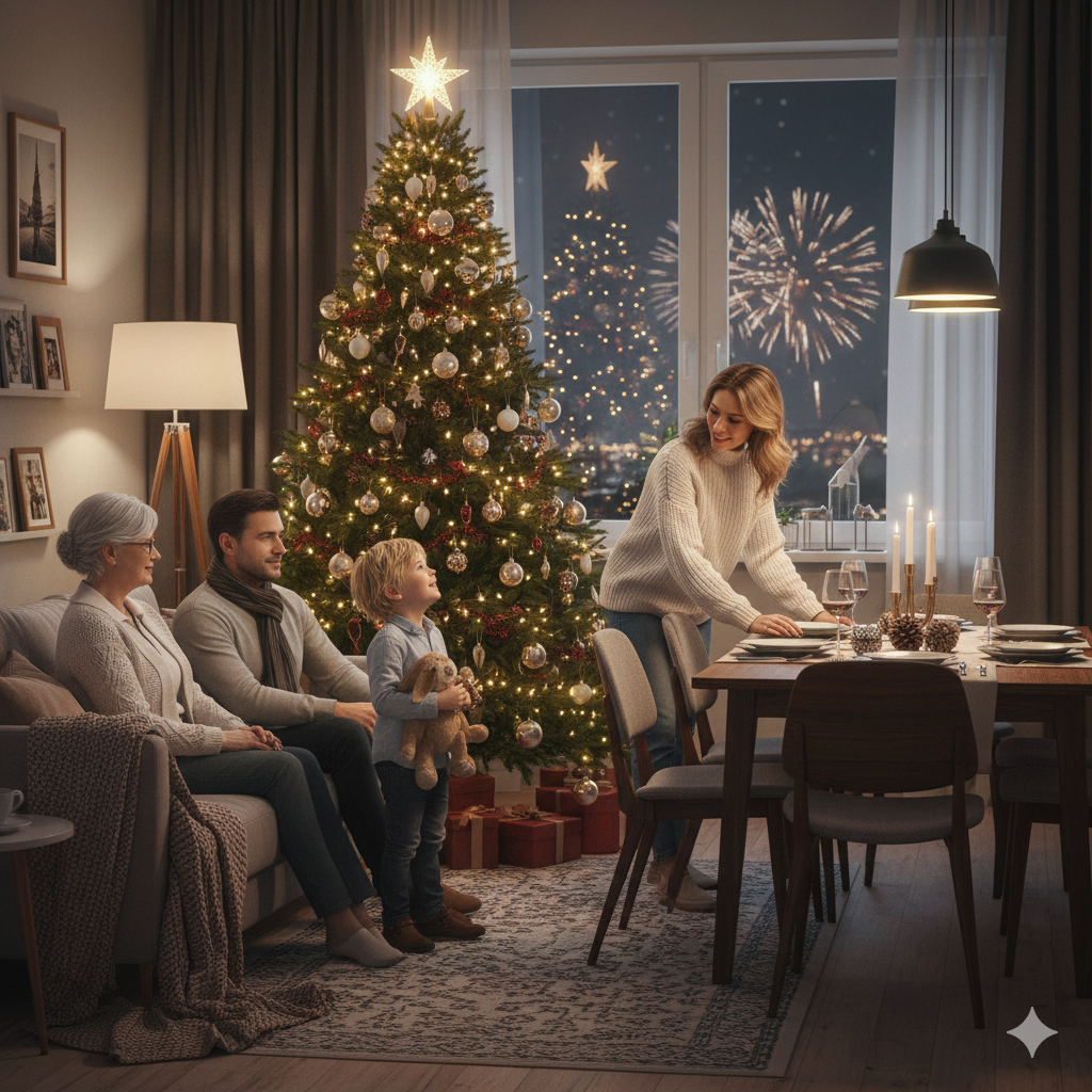 Когда Виктор вышел из ванной, до боя курантов оставалось минут десять. Все собрались у телевизора в гостиной. Катя сидела между бабушкой и дедушкой, Марина устроилась в кресле. Виктор молча сел на диван, подальше от всех.