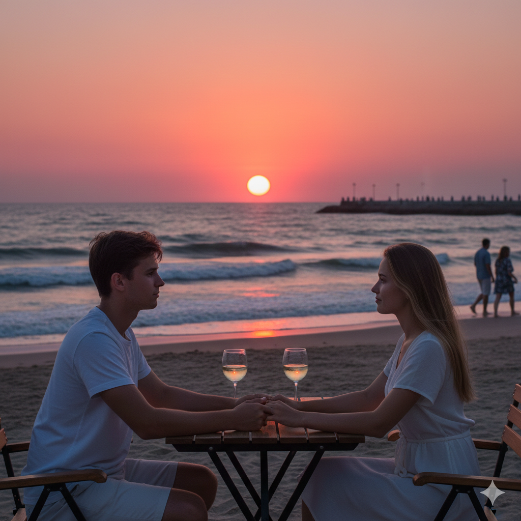 Потом они встречали закат в кафе на набережной. Это было чудесное зрелище. Солнце, огромное и огненно-красное, медленно погружалось в море, окрашивая небо в немыслимые оттенки розового, оранжевого и фиолетового. Волны лениво накатывали на берег, оставляя на песке пенные кружева. Воздух был наполнен запахом моря, цветов и лёгкой вечерней прохладой. Они сидели, держась за руки, и молча любовались этой красотой, чувствуя, как их души наполняются умиротворением и покоем.
