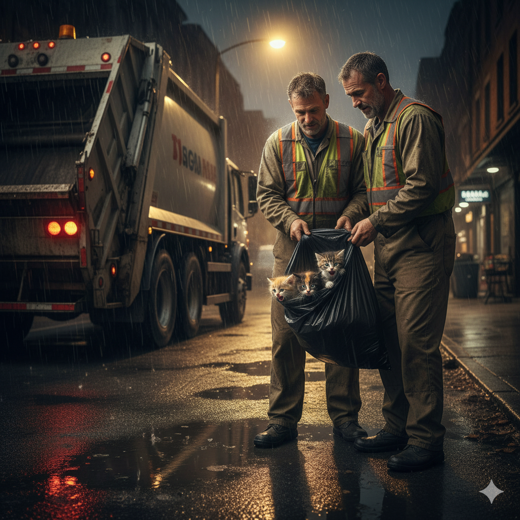 Водитель и два мусорщика фотографируются на фоне своей мусорной машины с очередными спасёнными малышами и пишут: