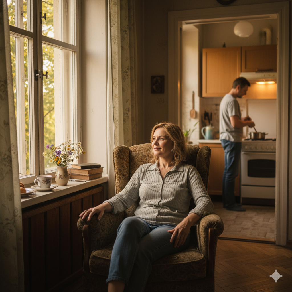 Я сидела в кресле у окна — в том самом, где плакала год назад. Только теперь я не плакала. Я улыбалась.