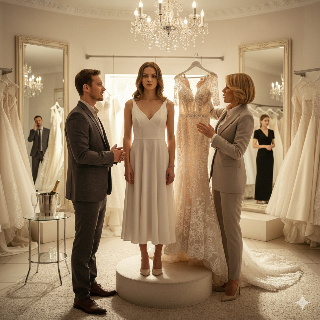 Настя стояла на подиуме, чувствуя себя манекеном. На неё натягивали одно платье за другим — пышные, блестящие, тяжелые. Они были красивыми, безусловно. Но чужими.