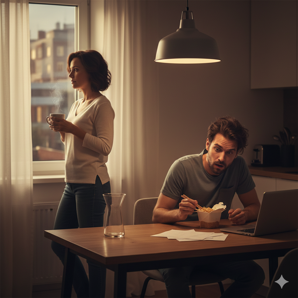 Антонина сидела за кухонным столом и смотрела, как муж поглощает очередную порцию заказанной лапши. Ел он жадно, неряшливо, капая соусом на футболку.