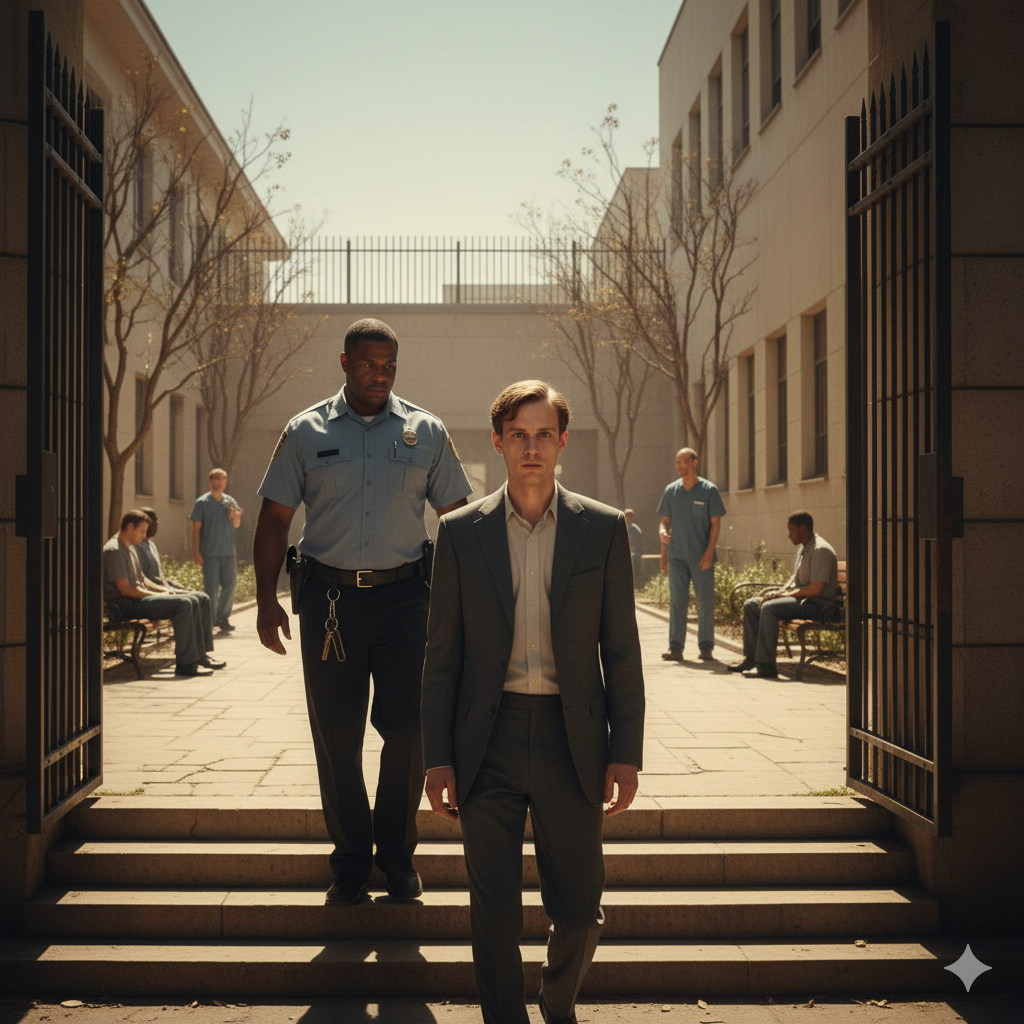 С высокого крыльца спускается мужчина неопределённого возраста в костюме. Он очень худой, с отёкшим лицом и мутным взглядом. В этом уставшем от жизни человеке едва можно узнать ещё год назад жизнерадостного двадцатилетнего Михаила. Его провожает до ворот солидный охранник. Брякая ключами, он открывает их и выпускает бывшего пациента.