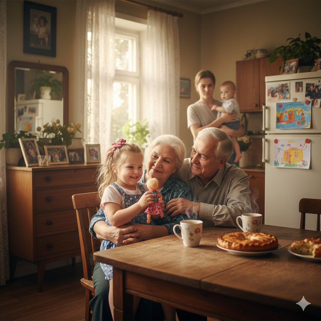 Ей и с бабушкой и дедушкой хорошо, ведь она для деда и бабушки — солнышко, умница, ягодка и звездочка. Она чувствует их любовь и они втроём вместе теперь очень счастливы…