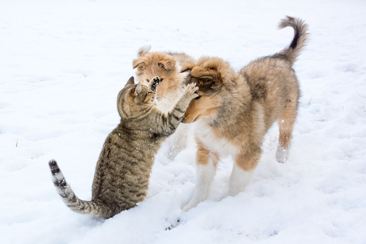 Щенки звонко залаяли, а кот, взъерошив шерсть и громко шипя, забрался на забор.