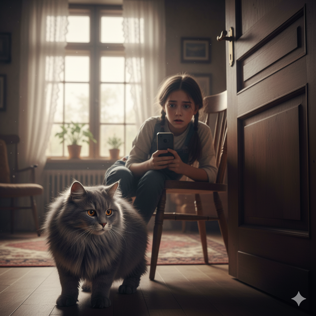 Самая-самая обычная, простая и безродная кошка. Мама с папой не были против, она тронула сердца всей семьи… Поначалу очень худенькая, спинка – толщиной в собственный, тоненький хвостик.