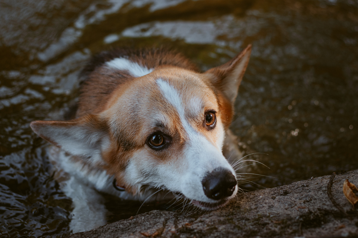 Бурлящая река накрывала собаку с головой, но уже через секунду эта самая голова появлялась на поверхности.