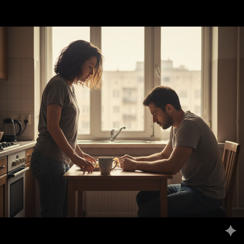 Мужчина переступил через порог, чувствуя, как напряжена обстановка в квартире. Всё здесь было знакомым до боли – обои в прихожей, полка с обувью, запах домашней еды, доносящийся из кухни. Но теперь это пространство будто разделилось на “до” и “после”, и он уже не чувствовал себя здесь своим.