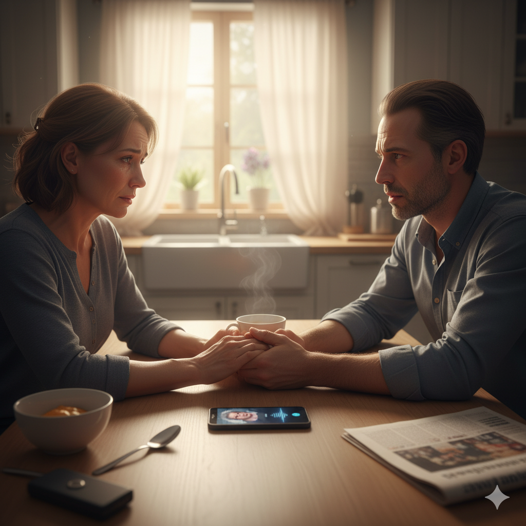Шум шагов заставил меня вздрогнуть. Олег вошёл в кухню, как-то неловко теребя телефон. Его лицо было бледным, глаза — полные вины и растерянности.