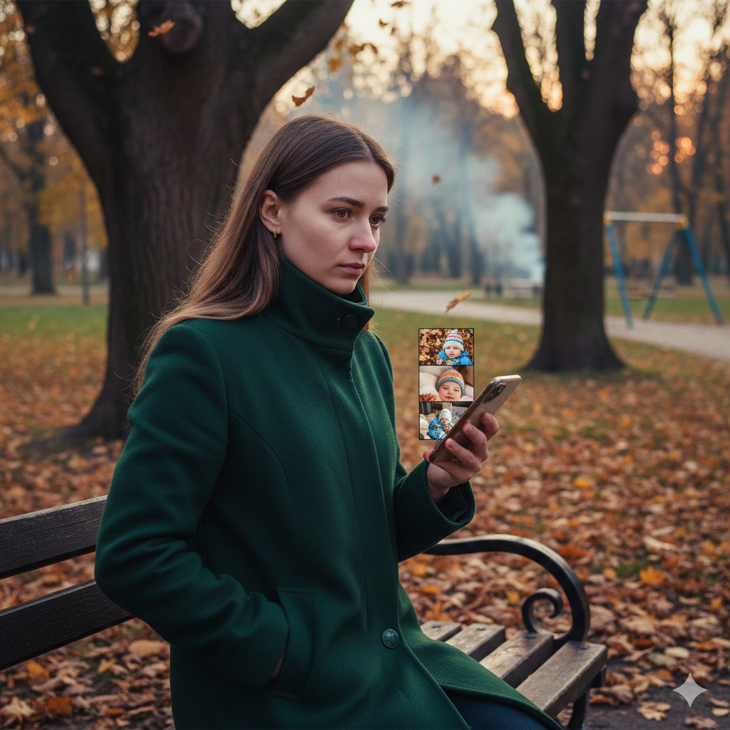 Девушка опустилась на ближайшую скамейку, чувствуя, как прохладное дерево касается спины. Вокруг шуршала опавшая листва, а в воздухе витал свежий, чуть терпкий запах осени – смесь сырости, прелых листьев и далёкого дыма от костров. Она достала телефон, пальцы слегка дрожали, хотя она и не понимала почему. Открыла папку с фотографиями – ту самую, которую давно не решалась пересматривать. Эти снимки она делала тайком в первые месяцы, когда ещё изо всех сил пыталась убедить себя, что всё получится, что она сможет стать для Миши настоящей матерью.