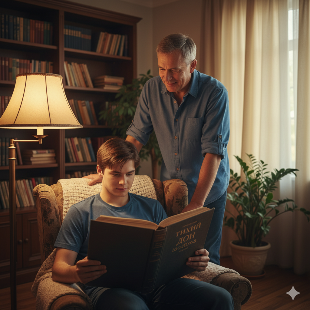 Василий пришёл сегодня с работы раньше обычного, и с удивлением обнаружил, что его сын Григорий, вместо того, чтобы находиться а институте, сидит дома в кресле с книжкой в руках. И книжка эта оказалась совсем не учебником.