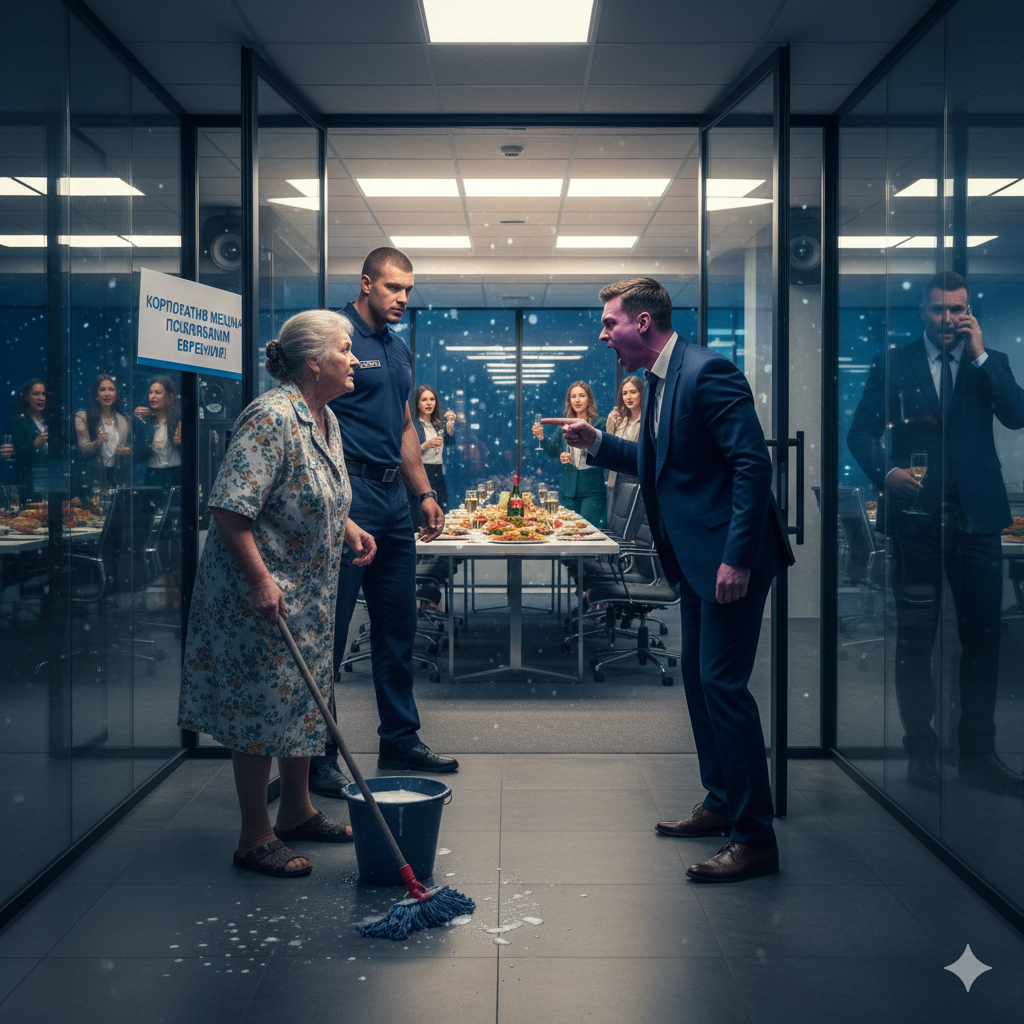 Варвара Петровна бодро шла с ведром и шваброй мимо стеклянных дверей. Внутри сидели мужчины в костюмах, женщины в платьях, а фуршетный стол, как говорится, ломился от яств.