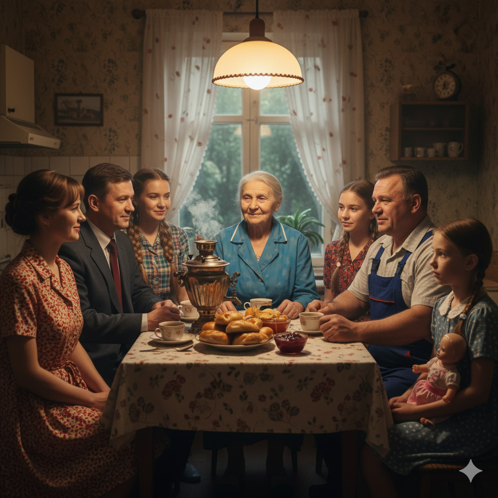 Валентина Степановна сидела в своей квартире, окружённая фотографиями этих людей. Катюша делала уроки за столом.