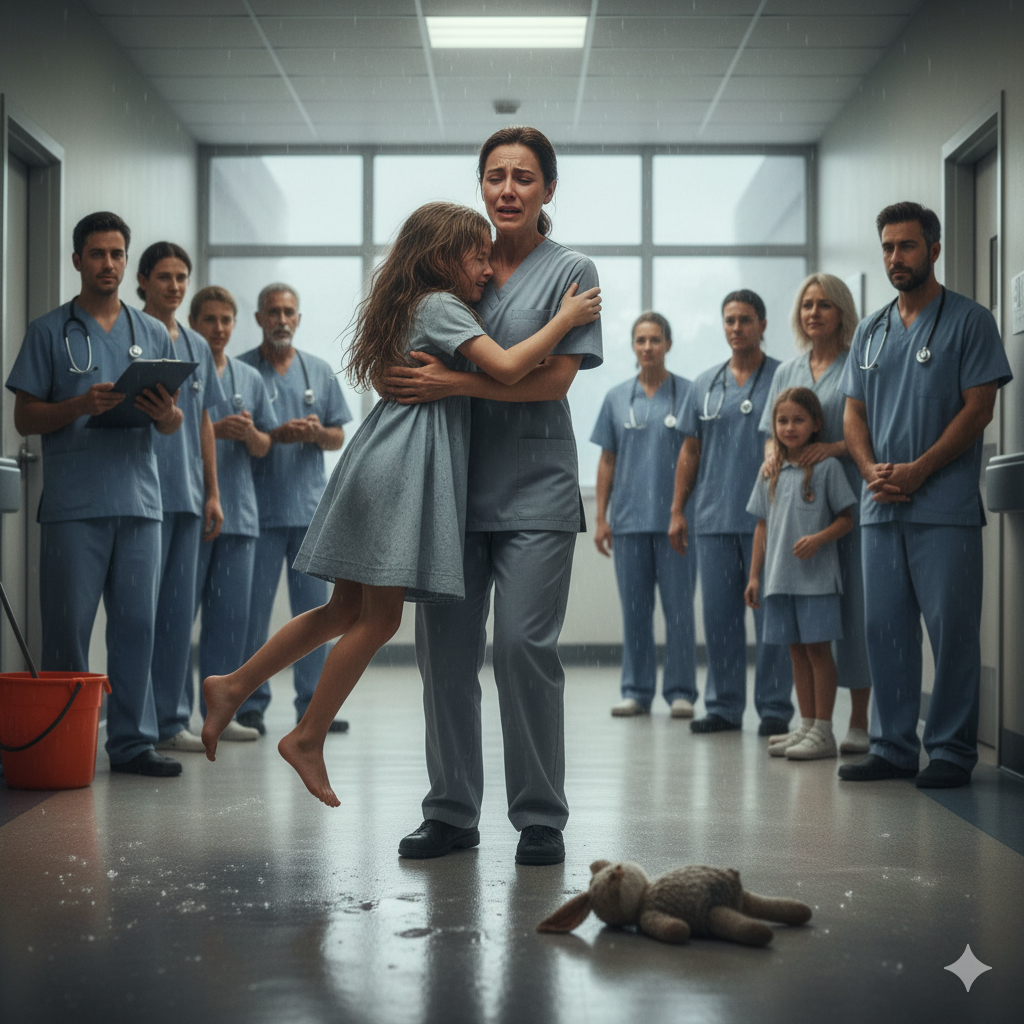 Никто не ожидал, что произойдет дальше. Ника замерла, уставившись на женщину с ведром и шваброй. Уронила своего любимого зайца и бросилась к санитарке, крича на бегу: «Мама! Мамочка!».