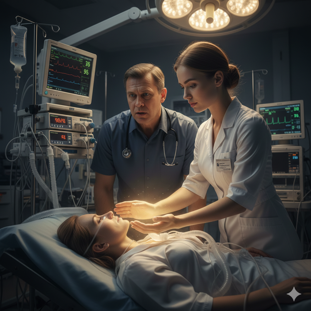 Новая медсестра сняла с рук перчатки и держала их над головой больной, а от её ладоней … исходило ясно видимое сияние!