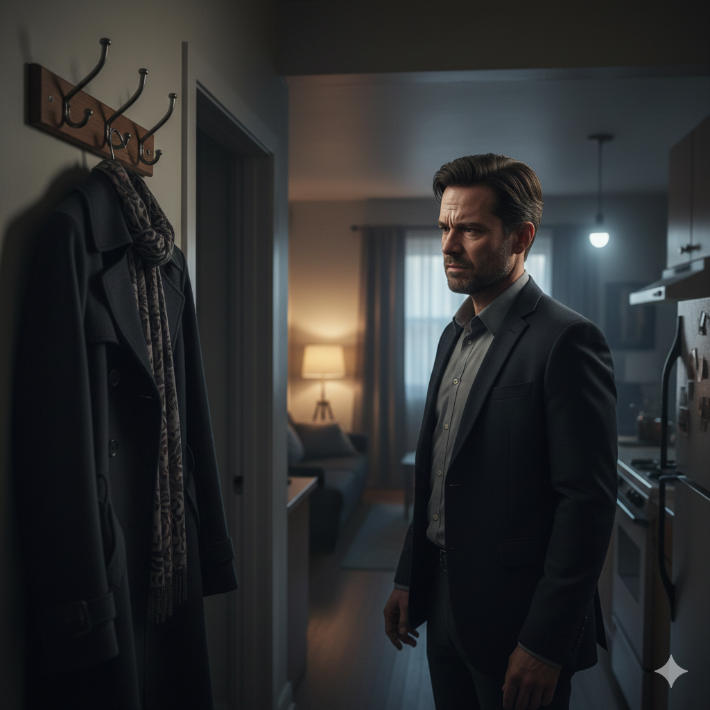 Вечер. В квартиру с работы входит муж. Видит на вешалке знакомое пальто. Понял — «в гостях опять подружка жены Настя». Вздохнул и прошёл в комнату.