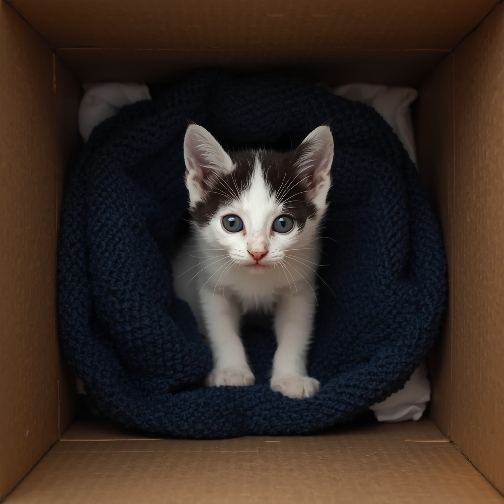 Вся семья подошла к коробке и заглянула туда. Там сидел грязный и очень худой котёнок.