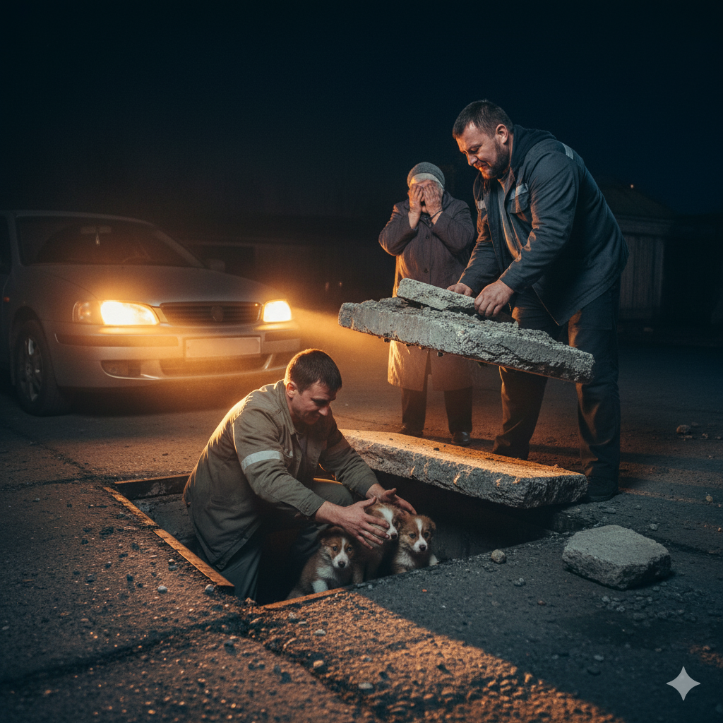 Михаил подогнал к этому месту свою машину, включил фары, чтобы светлее было, и они вместе продолжали разбор завалов. И вот, спустя несколько часов им, наконец, удалось убрать всё, что мешало. Михаил аккуратно спустился в смотровую яму, поскольку был компактнее, схватил щенков и вытянув руки, отдал их своему напарнику.