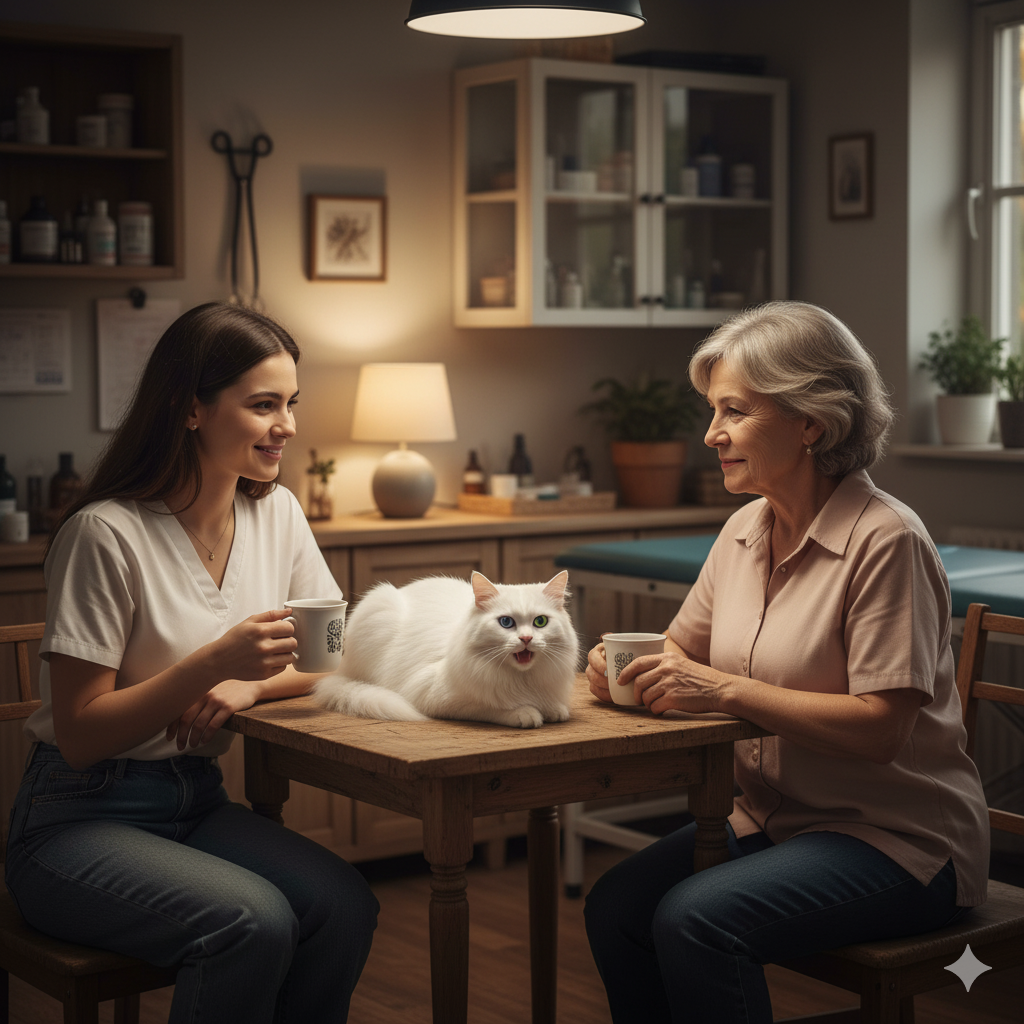 Женский смех разносился по пустым коридорам ветеринарной клиники. А в перерывах между ним было слышно громкое мурчание счастливой ОБЩЕЙ кошки..