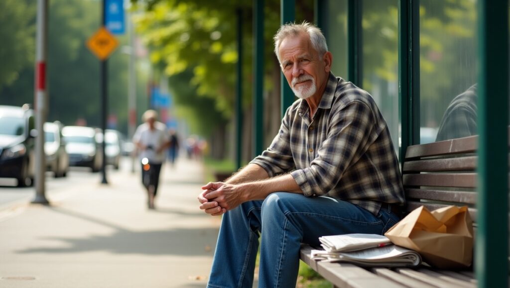 Пожилой мужчина в клетчатой рубашке пытался прикрыть от солнца полупрозрачным пакетом голову — пакет скользил, ветер срывал его, он снова надевал, как колпак, и всё повторялось. Его движения были неспешны, почти ритуальны, как у человека, давно привыкшего к беспомощности погоды и городской суеты.