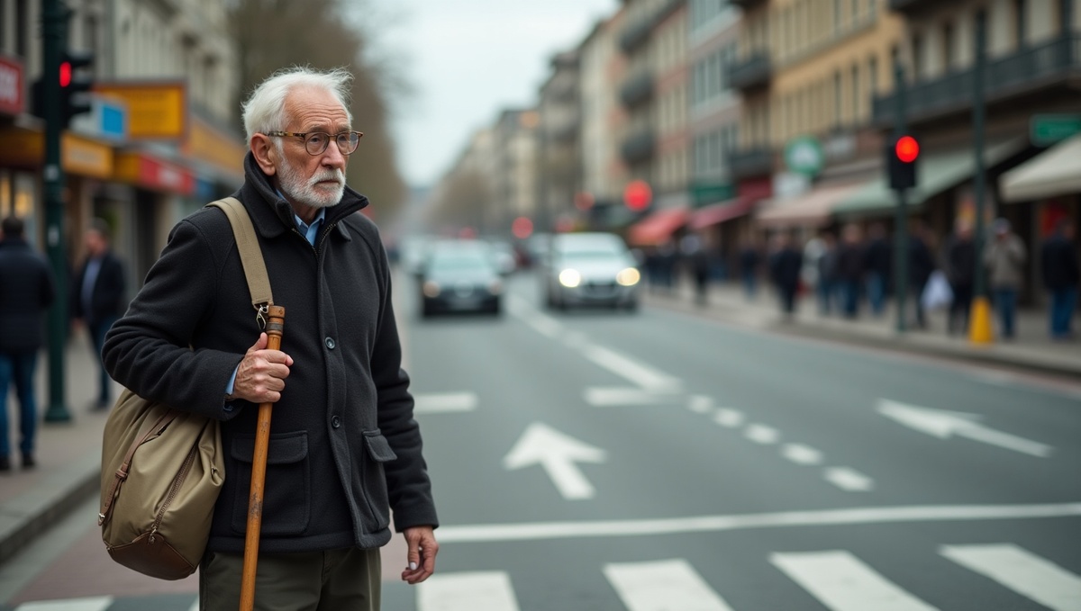 На перекрёстке, пока он ждал зелёный свет, его внимание привлекла фигура пожилого мужчины. Тот стоял у перехода, опираясь на трость, и растерянно оглядывался. Одет скромно: потёртое пальто, старый шарф, ботинки, явно видавшие лучшие времена. В руках — старая холщовая сумка, наполненная чем-то тяжёлым. Весь его вид говорил о том, что дорога даётся ему с трудом.