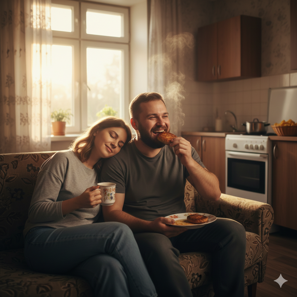 Трудности, конечно, были. Денег мало, мебели почти нет. Но вечерами они сидели на стареньком диванчике, пили чай из двух кружек и смотрели на маленькую, но чистую кухню, где пахло их едой, их жизнью.