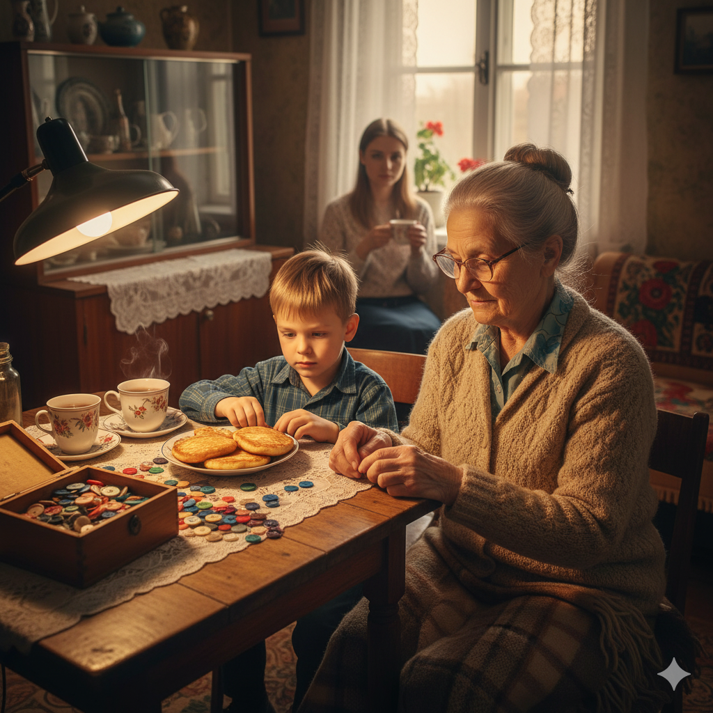 Ольга Павловна, отложив в сторону плед, обнаружила, что забытые навыки просыпаются сами собой. Она пекла оладьи, вспоминая, как ее сын, теперь успешный менеджер в далеком Питере, обожал хрустящие корочки. Она достала старую шкатулку с пуговицами — разноцветное, переливающееся богатство. Они с Егором часами выкладывали из них разные фигуры: цветы, кораблики, загадочных животных.