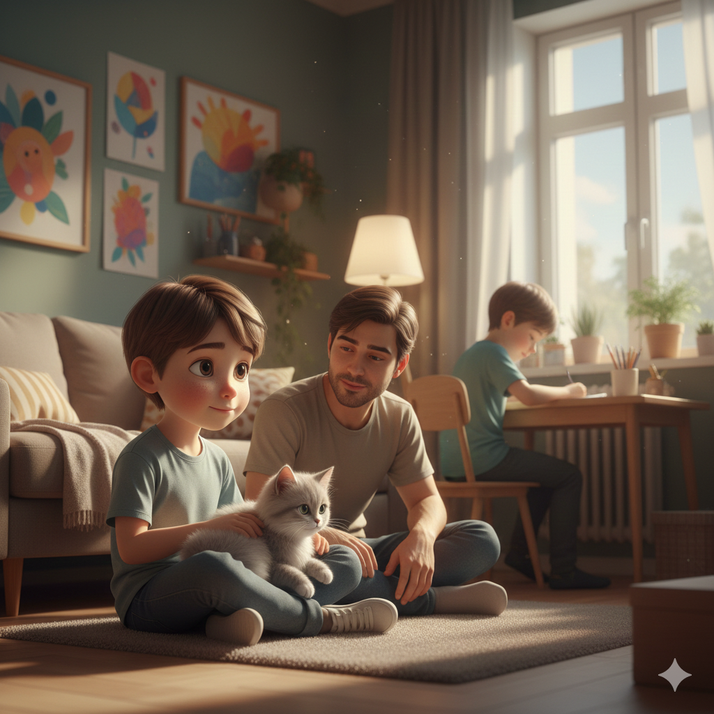 — Смотри, он с ней спокойнее, — заметил отец, наблюдая, как Максим сидит на полу, гладя кошку.