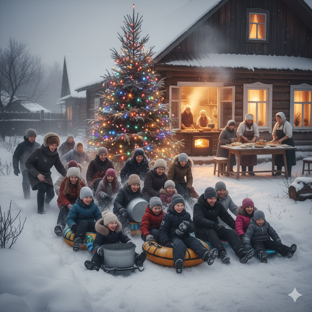 А на следующий день, на снежной горе за деревней, устроили массовые катания. На санках, тюбингах, картонках, тазиках и корытах, кто на чём, скатывались под визг и хохот, парни, девки, мужики и бабы, вперемешку с детворой. Барахтались в снегу и вновь забирались на гору.