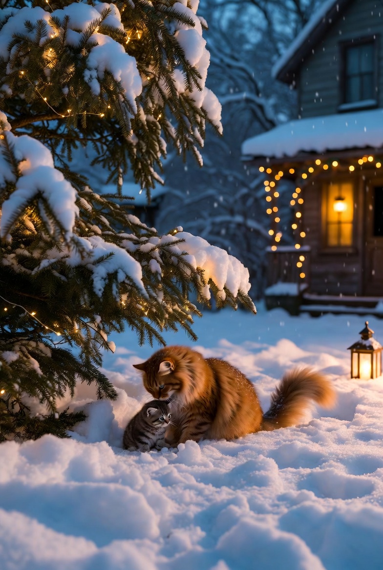 Его густая шерсть отливала золотом в свете вечерних фонарей, а усы подрагивали от лёгкого морозного ветерка. Он неспешно обходил праздничное дерево, с интересом его рассматривая.