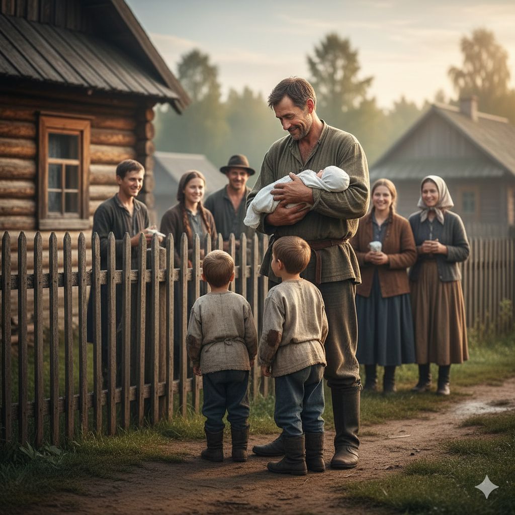 За калиткой стоит муж с младенцем на руках, рядом прыгают сыновья, пытаясь заглянуть в свёрток. «Приехал что ли кто?» — гадает она, перебирая мысленно всех соседей с детьми.