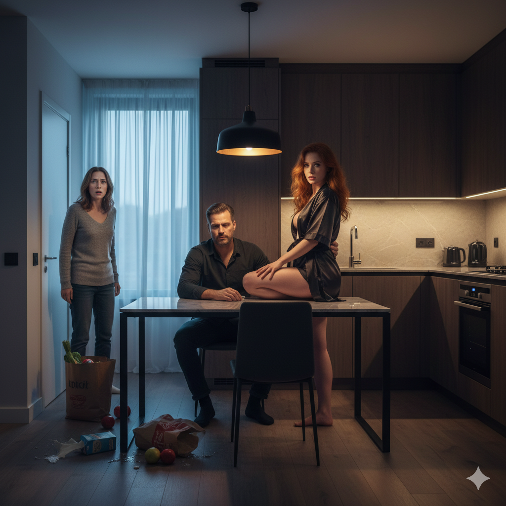 Смотрит на свет в окне своей квартиры. Два силуэта. Удивилась. Бегом поднимается по лестнице. Открывает замок, вбегает. На кухне за столом сидит муж с полуголой Оксаной у него на коленях. Смеются.