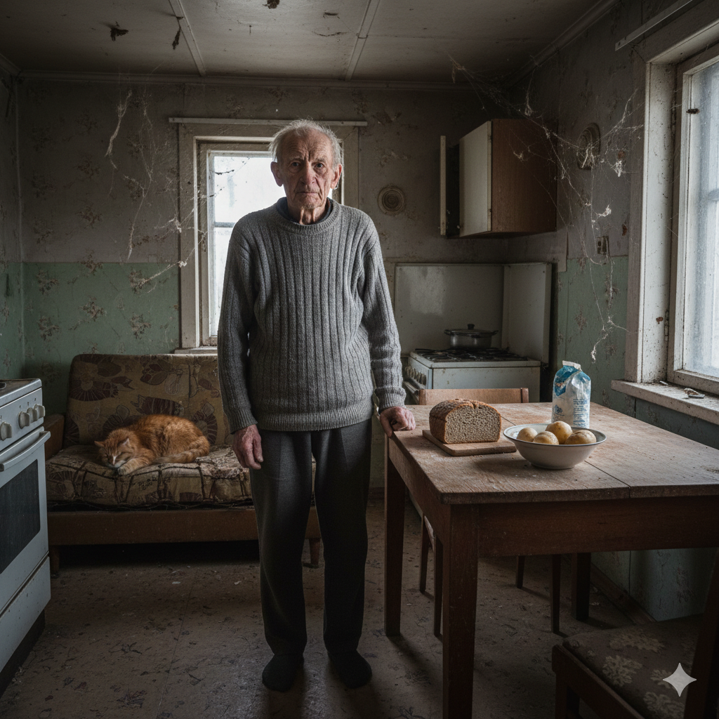 Пожилой старик стоял посреди кухни. Дрожащими руками он выкладывал на обеденный стол серый хлеб, картофель и пакет молока. Это всё что он мог себе позволить на свою скудную пенсию. Иван Николаевич давно жил один. Некогда красивый и уютный дом, за много лет отсутствия хозяйки пришёл в запустение. Тут и там можно было заметить длинную паутину, которая чем-то напоминала новогодние, пушистые гирлянды. Некогда белые тюлевые занавески были покрыты серой пылью, а окна от грязи еле-еле пропускали свет в тёмное помещение. Отварив картошки, и поужинав Иван Николаевич отправился в гостиную. Там на старом погнутом диване, из которого во все стороны торчали пружины, вальяжно возлежал большой рыжий кот.