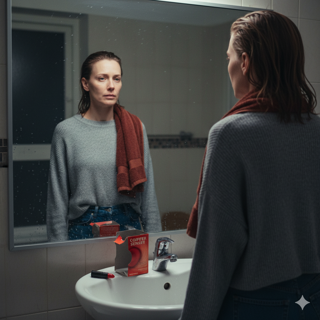 Отражение в зеркале было ей незнакомо. Яркие, почти вызывающие губы кричали, в то время как ее глаза оставались испуганными и приглушенными. Она уже хотела стереть все, но прозвучал звонок в дверь.