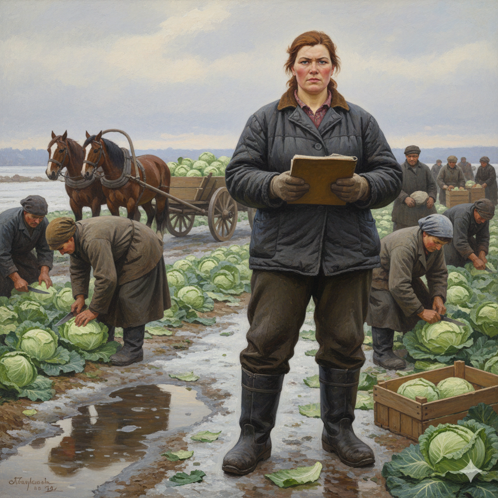 Она бросила в общую гору два увесистых кочана капусты и отряхнула с ладоней жёлтую пыль. Люда окинула опытным, оценивающим взором всё поле и работающих на нём людей, после чего внесла несколько записей в свой журнал.