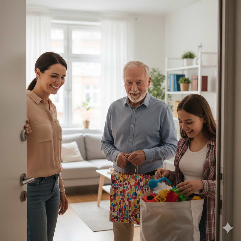 Маша, услышав незнакомый голос, выглянула из детской. Увидев дедушку, которого плохо помнила, она насторожилась, но ее взгляд привлек розовый пакет.