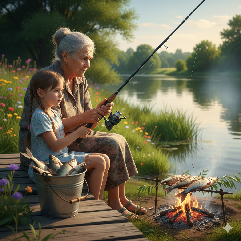 И червей на крючок она надевала, и рыбу чистила, и на прутик ивовый нанизывала, да жарила.