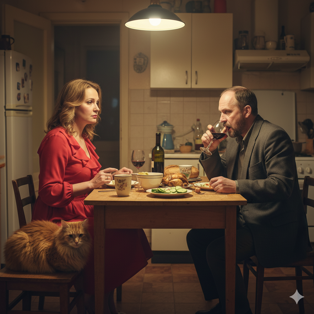Нарядившись, Людмила продефилировала на кухню. Михаил поглощал варёную колбасу в прикуску с солёным огурцом, запивая красным вином. Всё это он достал из холодильника хозяйки.