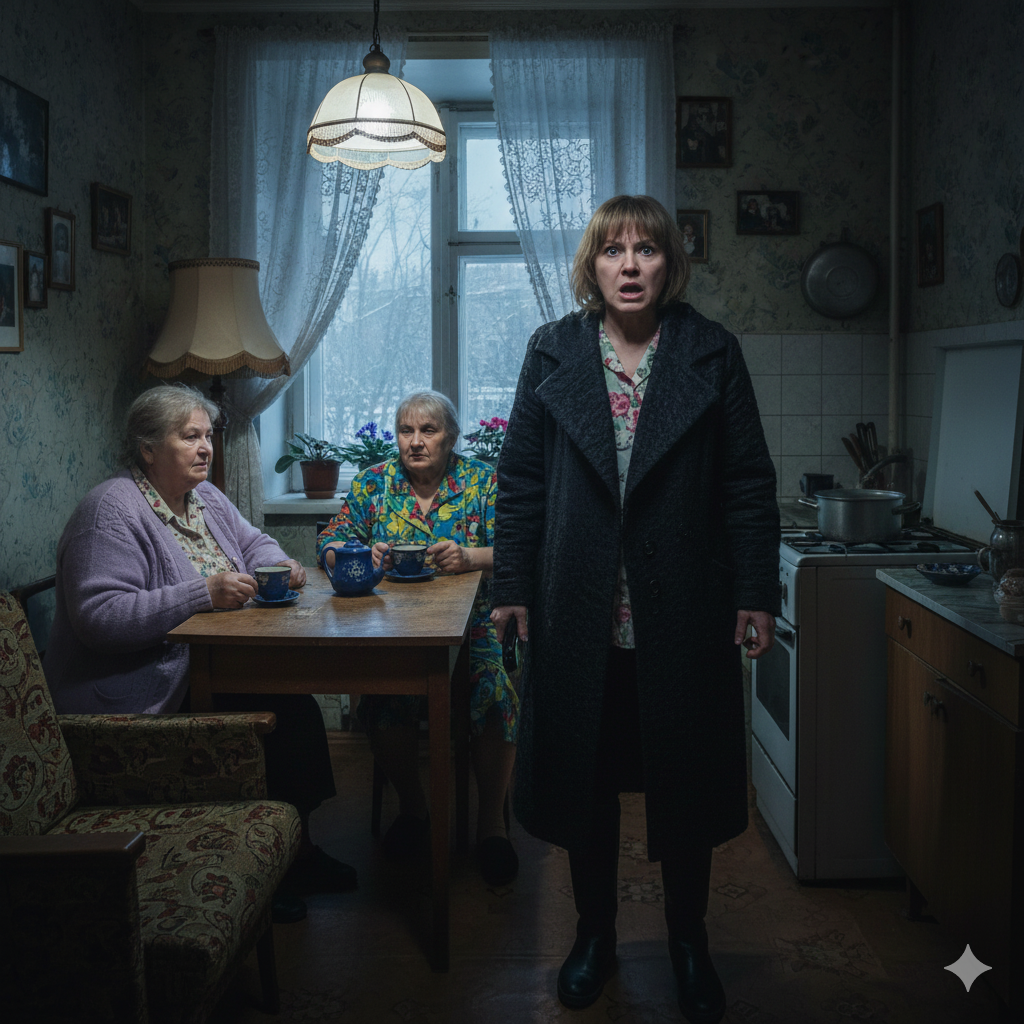 На кухне за столом, где тетя Рита кормила своих кошек, сидели две женщины. Одна — соседка снизу Валентина Петровна в цветастом халате. Вторая — моя свекровь Галина Ивановна в своем любимом сиреневом кардигане, который я подарила ей на прошлый день рождения.