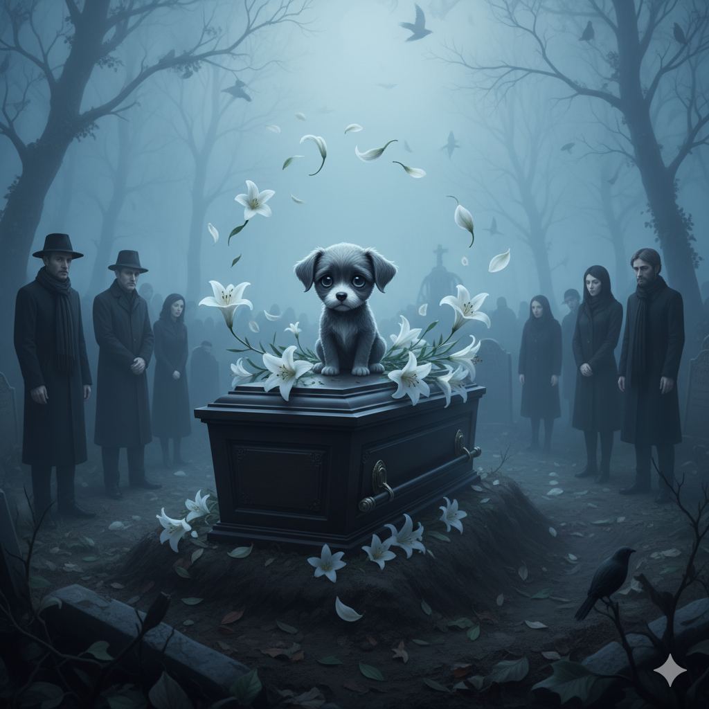 Туман стелился над старым кладбищем, где собрались люди в чёрных одеждах. Похороны Анны проходили тихо, лишь всхлипы родных нарушали тишину. Её гроб, украшенный белыми лилиями, стоял у края могилы, готовый опуститься в землю. Все взгляды были прикованы к нему, когда маленький щенок, незаметно пробравшийся на церемонию, вдруг запрыгнул на крышку гроба.