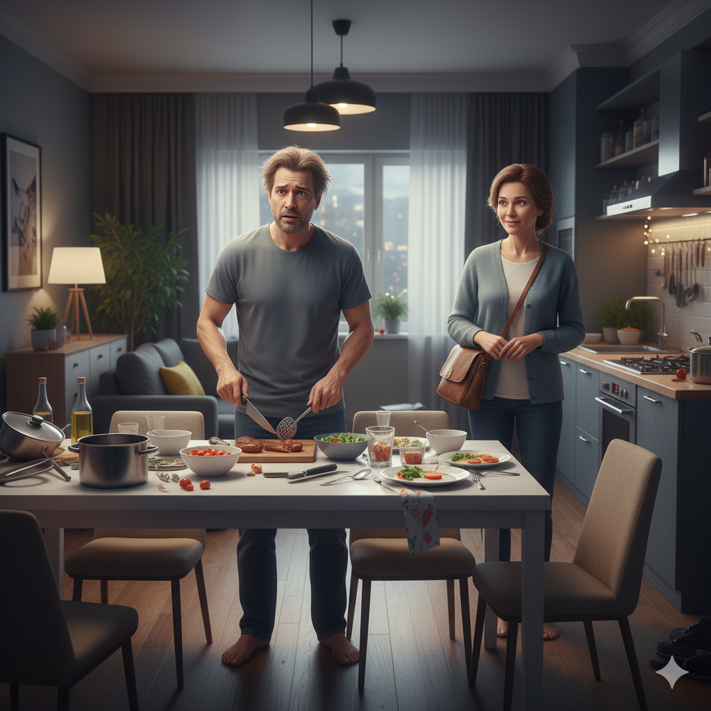 К полудню на кухне царил хаос. Анатолий стоял посреди разгрома, понимая, что ничего не успевает. Мясо пригорело, картошка разварилась, а салат получился каким-то странным. Он чувствовал себя абсолютно беспомощным.
