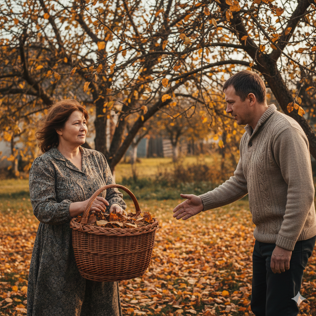 Екатерина стояла между яблонями, собирала опавшие листья в корзину. На щеке у неё была прядь волос. Максим спал дома. Она была одна.