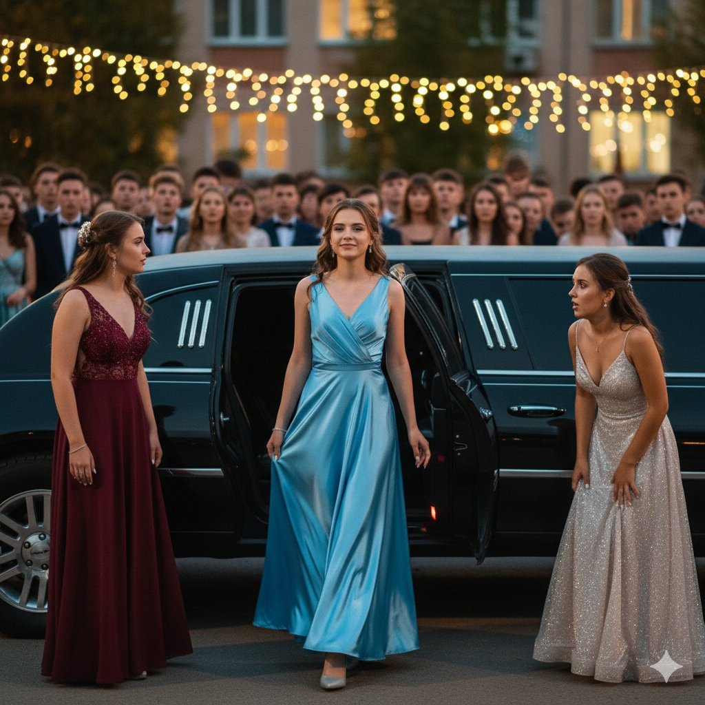 Школьный двор гудел от шума и музыки. Одноклассники хвастались нарядами, фотографировались у дорогих машин. Карина, в кричаще-розовом платье, уже позировала перед толпой, когда чёрный лимузин плавно подкатил к входу. Дверь открылась, и Лиза вышла — спокойная, с высоко поднятой головой. Шёлк платья мягко сиял в свете фонарей, а её уверенная улыбка заставила толпу замереть. Шёпот прокатился по двору: «Это кто? Лиза? Дочь уборщицы?»