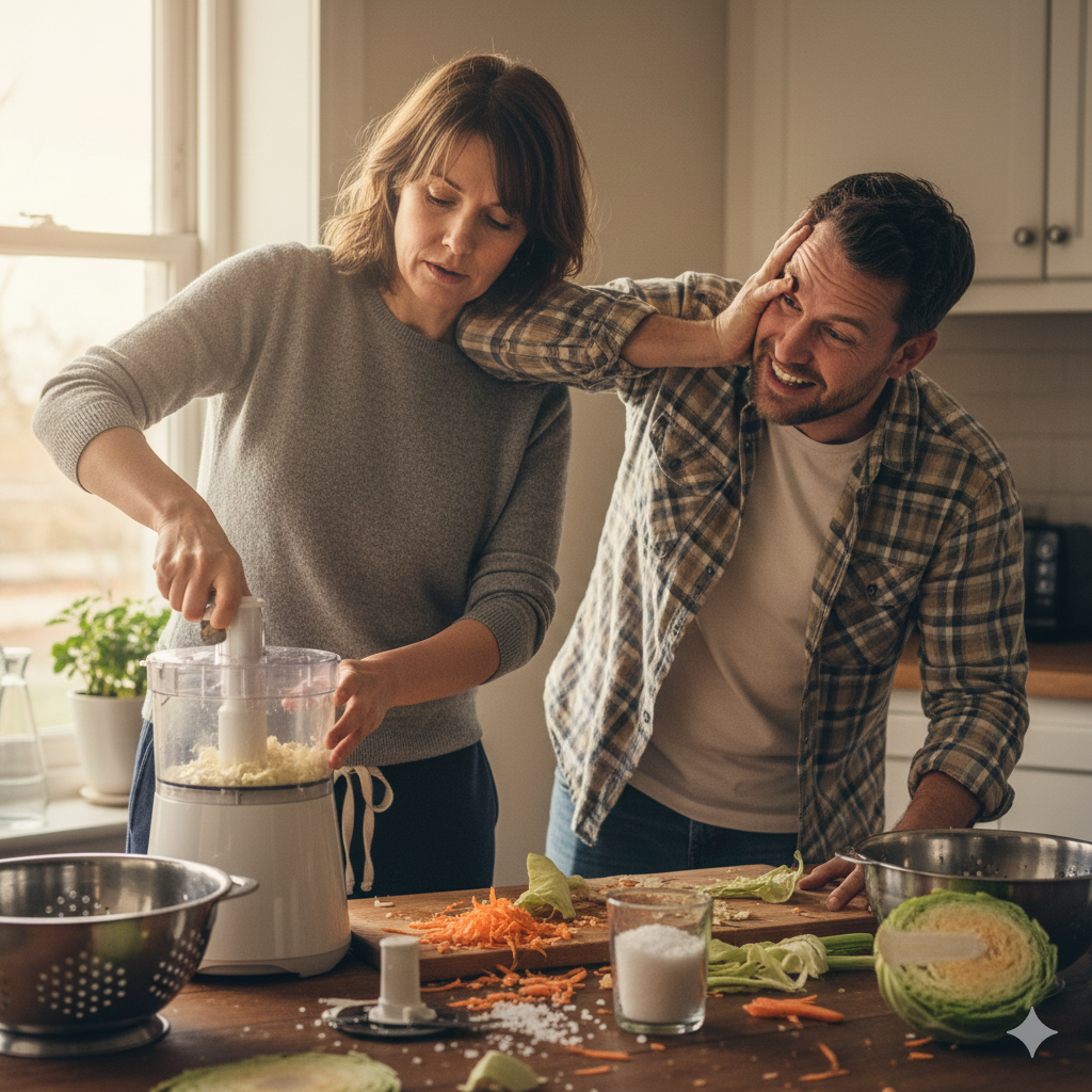 С капустой Вера уже почти закончила, так что, муж явился вовремя. Он ее перемешал и перемял. Для этого он, в принципе, на кухне и нужен был.