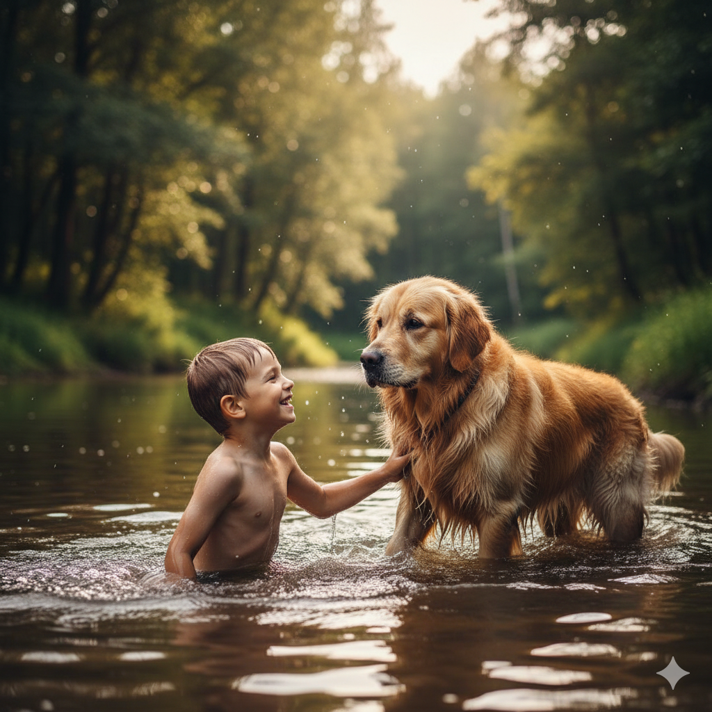 Мишка вышел из воды, а рядом стоял Шарик и укоризненно смотрел на него своими серьезными глазами, словно безмолвно спрашивая: